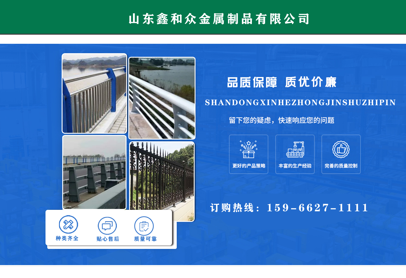 山東鑫和眾金屬制品有限公司主要產(chǎn)品有防撞護欄,橋梁護欄,道路護欄,河道護欄,不銹鋼護欄等護欄。提供設計方案,一站式定制,包您滿意價格優(yōu)惠,歡迎來電咨詢! 公司常年從事銷售護欄防撞護欄,橋梁護欄,道路護欄,河道護欄,不銹鋼護欄,橋梁鋼護欄,河道燈光護欄等。產(chǎn)品廣泛應用于橋梁、河道、旅游景區(qū)、道路、公路、公園、小區(qū)、景觀、道路防撞等領域。 公司產(chǎn)品均采用優(yōu)質不銹鋼材料,符合相關標準。各種型號不銹鋼復合管及護欄,質量嚴格把控。產(chǎn)品強度高、耐腐蝕、焊接牢固、抗沖擊、性能好,防撞護欄結構簡單、美觀實用大方。 歡迎前來訂購!...